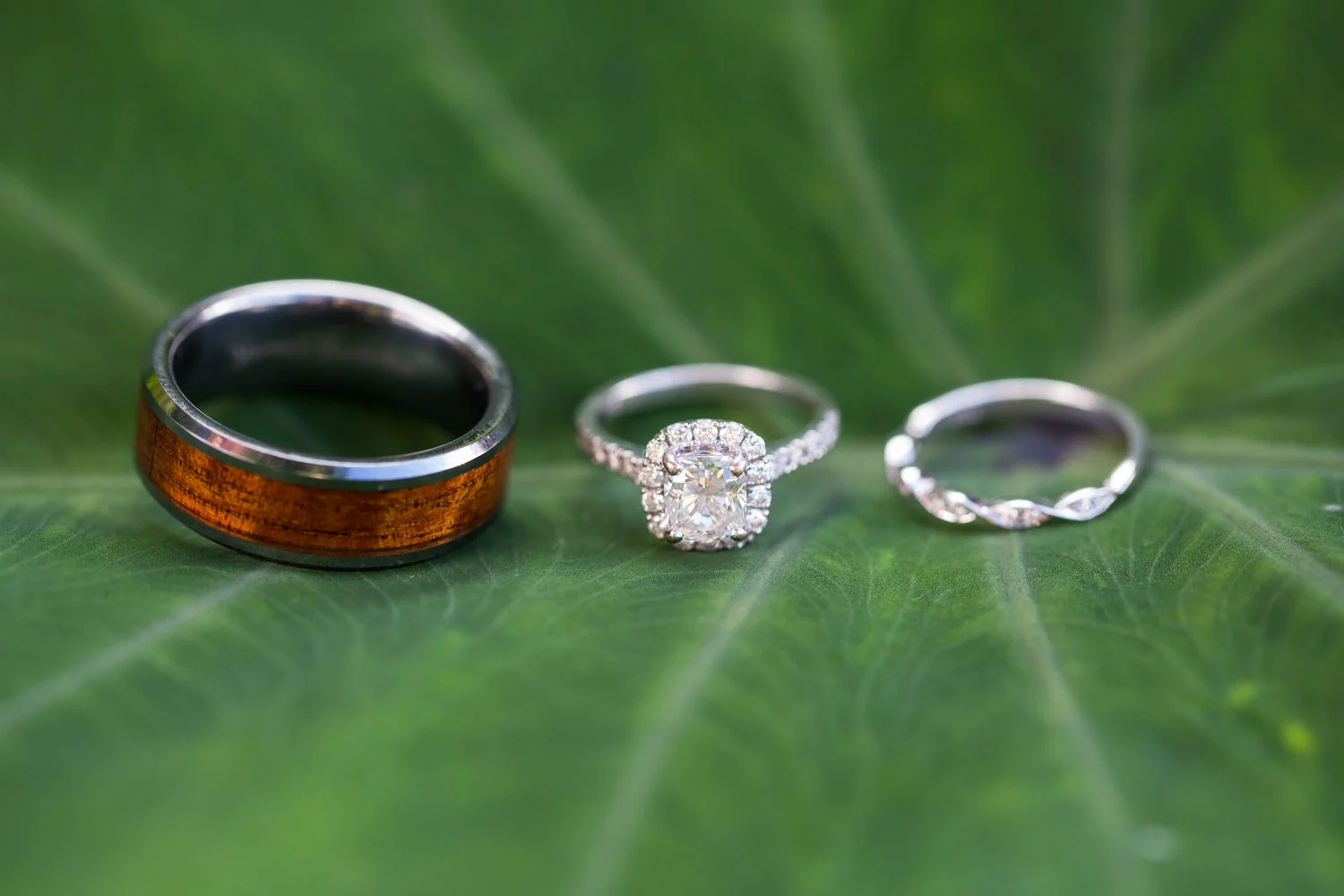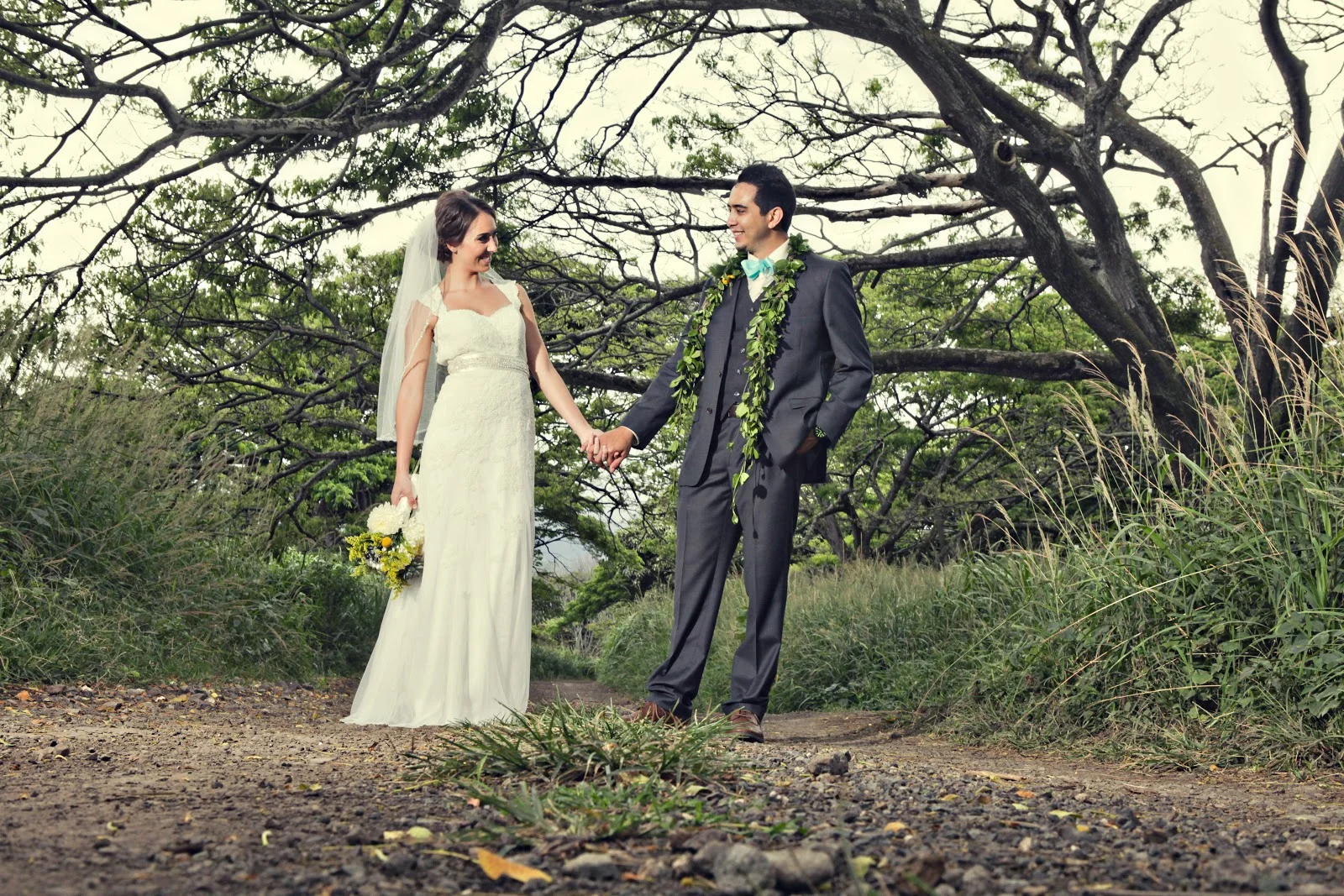 The lei is a symbol of love and aloha. It’s common for a wedding ceremony in Hawaii to begin with a the bride and groom exchanging lei. Additionally, the groom may want to wear a garland of green maile leaves while the bride wears a haku lei (flower crown).